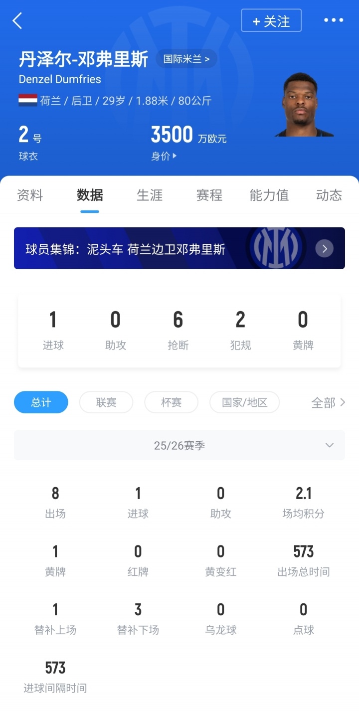 29岁的邓弗里斯本赛季代表国米出战8场比赛,打进1球,当今德回身价3500万欧。