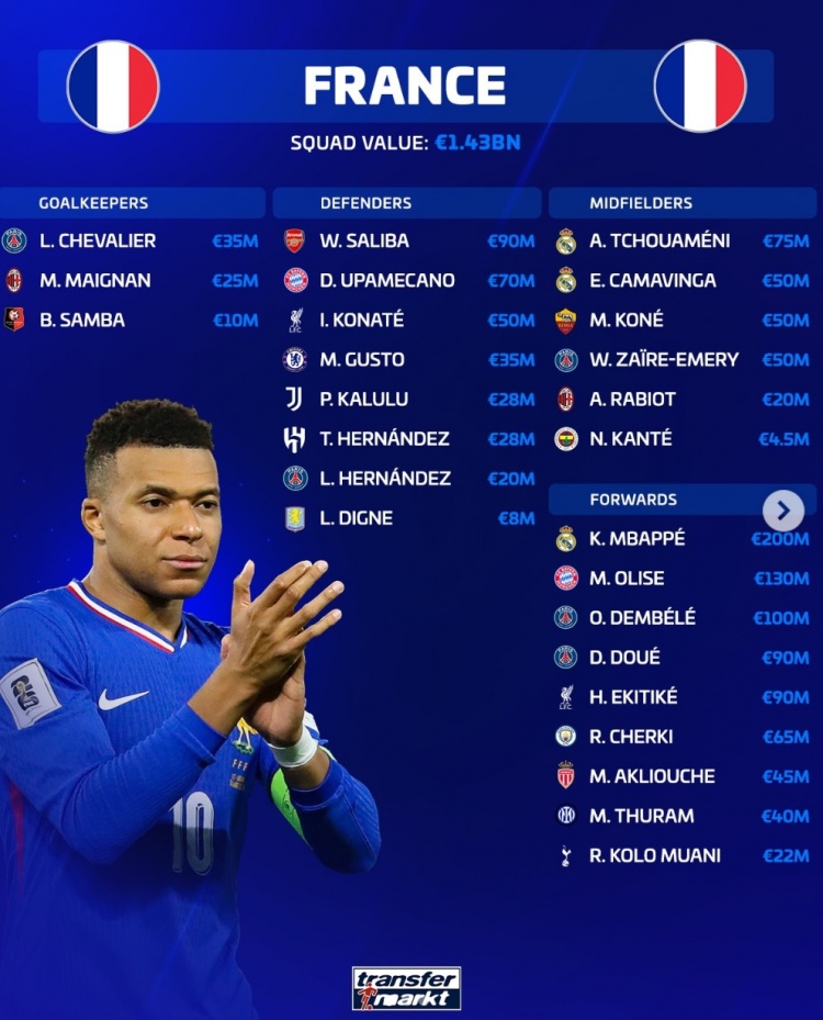 德转更新法国队身价:姆巴佩2亿欧、奥利塞1.3亿欧、登贝莱1亿欧