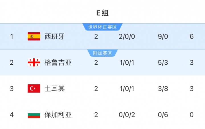 西班牙国度队将于10月中旬辞世初赛中对阵格鲁吉亚和保加利亚,当今西班牙积6分位列E组第一,跳跃格鲁吉亚3分。