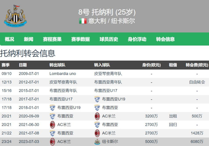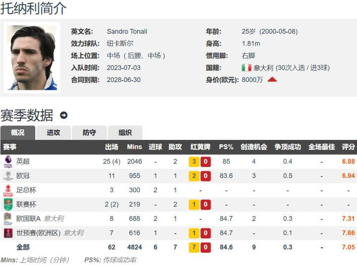 现年25岁的托纳利,身高1.81米,右脚球员,能踢后腰和中场球员,德转估价8000万欧元,与纽卡斯尔的合同至2028年。托纳利本赛季至今各项赛事共为纽卡斯尔出场47场,贡献3球7助。